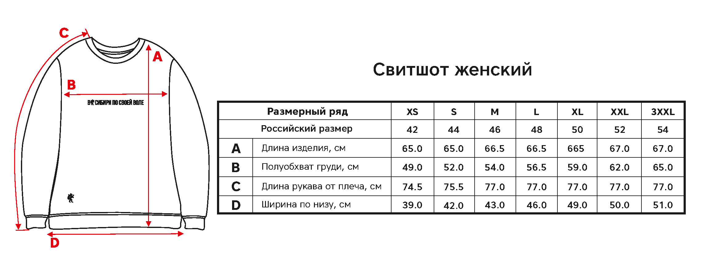 Базовый легкий свитшот со слоганом «В Сибири по своей воле». Аккуратный круглый вырез, свободный силуэт, резинки на горловине, манжетах и по нижнему краю. Материал — плотный и легкий хлопковый футер, который хорошо держит форму благодаря добавлению искусственных волокон. Сочетайте со своими любимыми вещами на прогулке или в поездке в любое время года.
